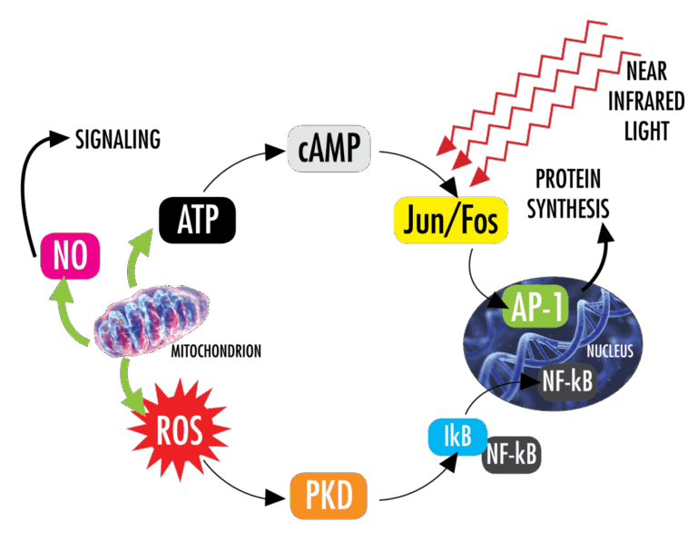 In addition to ATP, laser stimulation also produces free nitric oxide (NO) and modulates reactive oxygen species (ROS). NO is a powerful vasodilator and an important cellular signaling molecule involved in many physiological processes. ROS have been shown to affect many important physiological signaling pathways including the inflammatory response. Together, increased NO and improved ROS levels provide an environment for faster signaling, resulting in decreased inflammation.